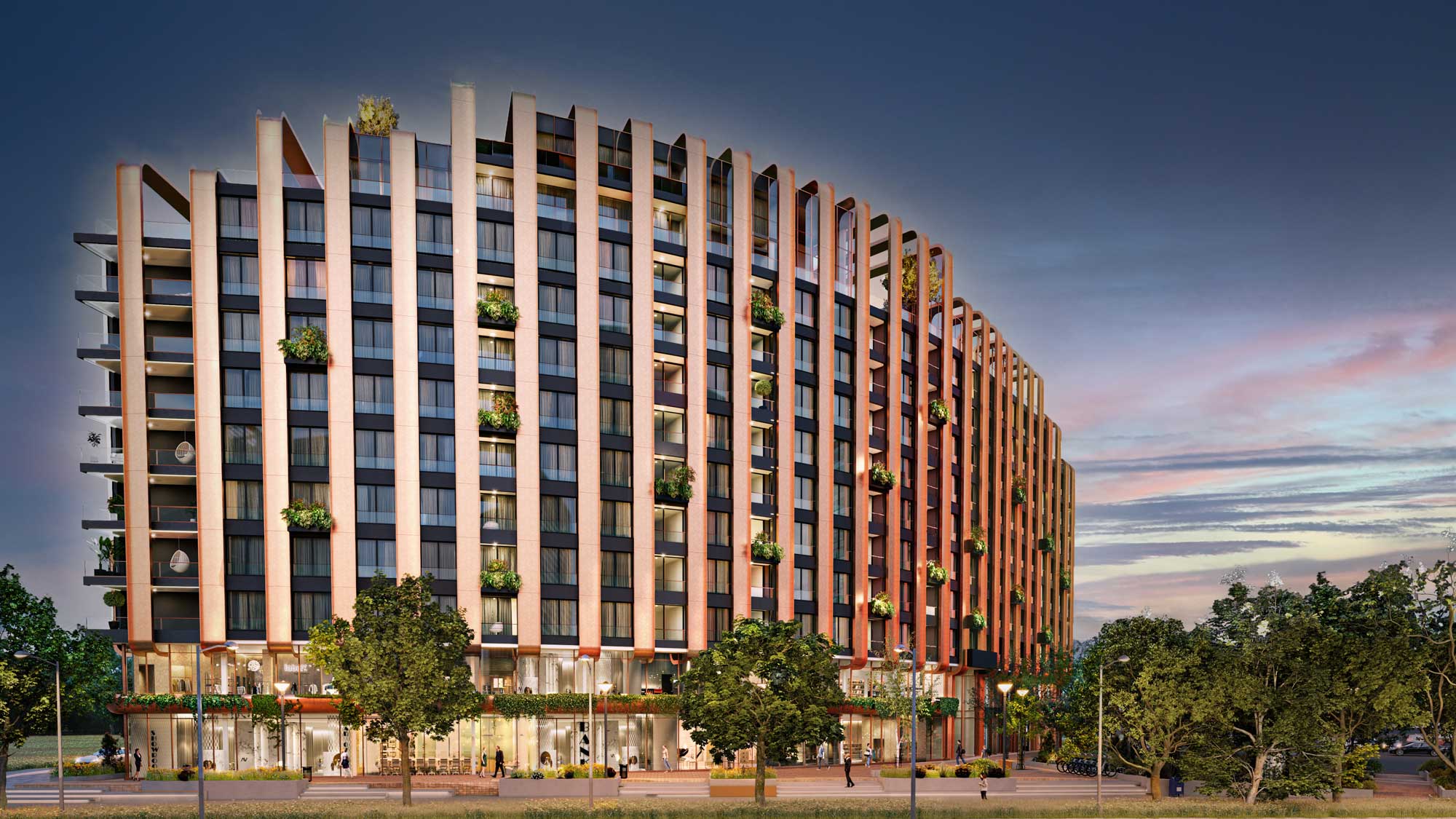 nije samo struktura, to je stav pretočen u simfoniju forme i funkcije. Emotivno odgovarajući na svoje okruženje, THE SYMPHONY besprekorno integriše monolitnu arhitekturu sa dinamičnim elementima koji je oživljavaju i prekidaju monotoniju. Vertikalne pruge, koje se graciozno uzdižu, kulminiraju zaobljenim vrhovima koji se prepliću jedni s drugima, stvarajući zadivljujuć utisak. Velike žardinjere postavljene duž monolitne fasade, domaćini bujnom bilju, unose vitalnost i pokret u arhitektonsku sliku. Ovi zeleni akcenti ne samo da pružaju osvježavajući kontrast, već doprinose i živopisnom, neprestano promjenjivom vizuelnom iskustvu.