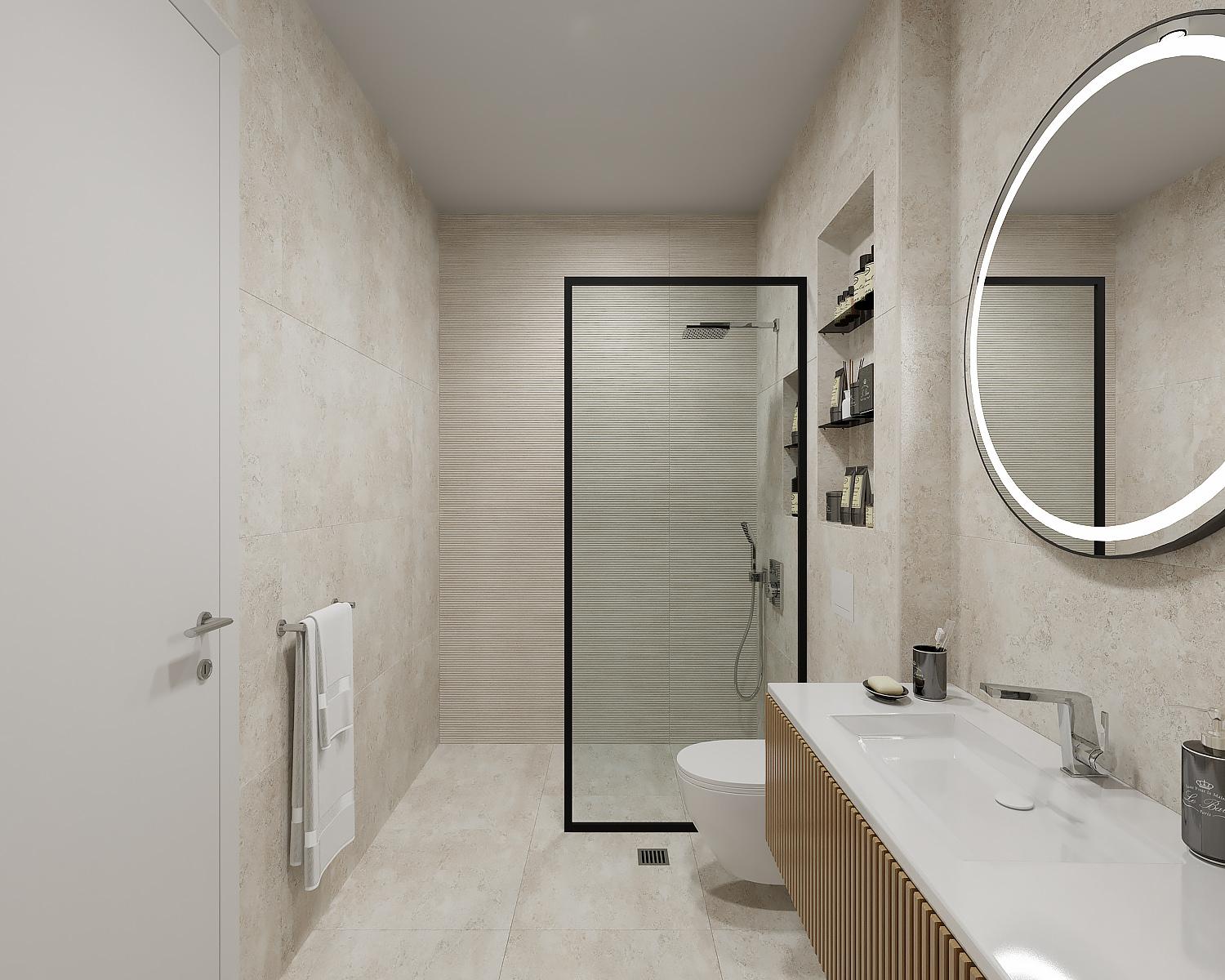 Kupatila su opremljena sa umivaonikom od kompozitnog materijala sa kvalitetnim ormarićem, ogledalom i slavinom Eckle, ugradbenom tuš baterijom proizvođača Eckle, tuš kabinom izrađenom od kaljenog stakla 8mm koja se montira direktno na keramičke pločice, higijenskom konzolnom wc školjkom Eckle sa soft-close daskom i ugradbenim vodkotlićem Tece.