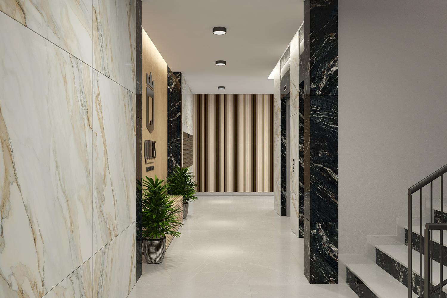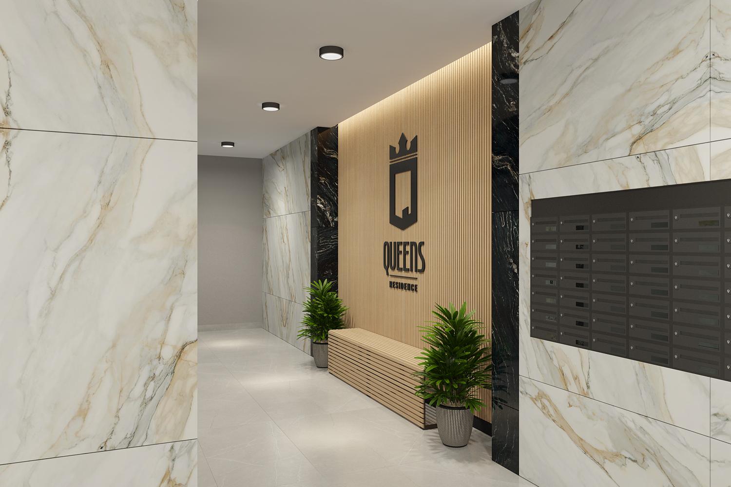 Zajedničke komunikacije i hodnici u stambenom objektu Queens su projektovani da svojim komforom i elegancijom upotpunjuju kvalitet stanovanja budućih stanara.
