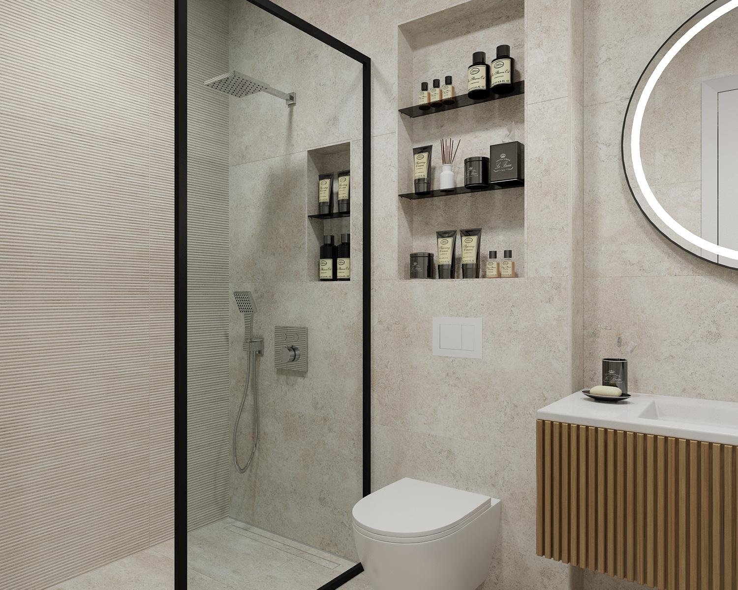 Kupatila su opremljena sa umivaonikom od kompozitnog materijala sa kvalitetnim ormarićem, ogledalom i slavinom Eckle, ugradbenom tuš baterijom proizvođača Eckle, tuš kabinom izrađenom od kaljenog stakla 8mm koja se montira direktno na keramičke pločice, higijenskom konzolnom wc školjkom Eckle sa soft-close daskom i ugradbenim vodkotlićem Tece.